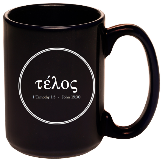 Our team and network of supporting friends enjoy coffee, especially with others. Creating the mug several years ago began as a gift to encourage friends, supporters, and neighbors to uniquely understand how the Bible's Greek word (telos) is used in scripture, revealing that the gospel powerfully affects us in real life. The affect is God's transformative process to love others in real, mundane life for no other reason but for them to discover and trust him. Hence the message on the mug following the two primary passages (John 19:30; 1 Timothy 1:5) with the Greek word for telos: